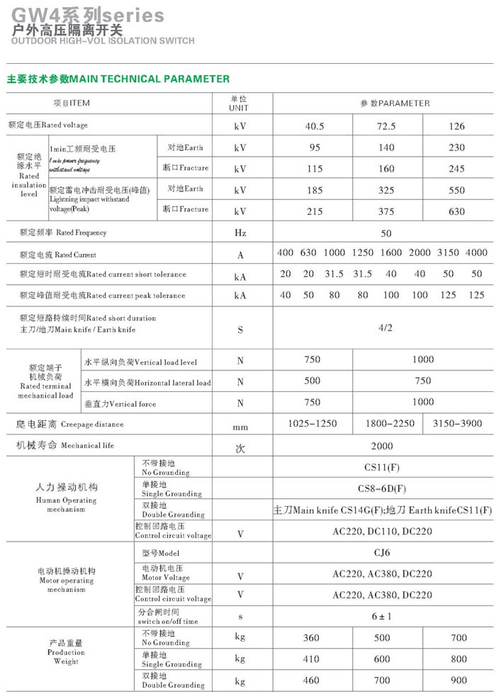 GW4-72.5kV銅管型隔離開關(guān)配用CS11-1型手力操作機(jī)構(gòu),GW4-72.5D型配用CS8-6D手力操作機(jī)構(gòu)。